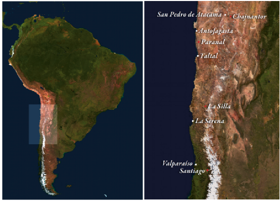 位于南美洲南北向最長的國家——智利。右側(cè)是左側(cè)白色陰影區(qū)域的放大圖,可以看到La Silla, Paranal,Chajnantor這三個(gè)臺(tái)站的位置。